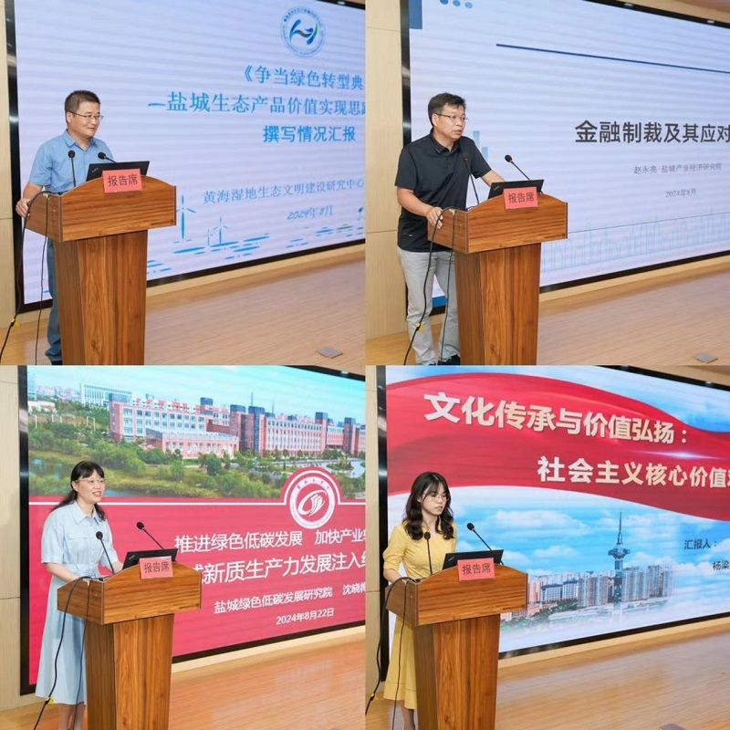 在成果分享环节,盐城黄海湿地生态文明建设研究中心研究员金银亮,分享了智库旗舰产品《争当绿色转型典范:盐城生态产品价值实现思路及对策》的撰写思路、基本内容和后期设想;盐城产业经济研究院院长赵永亮,分享了主题为《金融制裁及其应对研究》研究报告,从金融制裁概述与特点,制裁对经济金融的冲击及应对制裁的手段与措施进行了详细介绍;盐城绿色低碳发展研究院院长沈晓梅,分享了主题为《推进绿色低碳发展 加快产业转型升级》研究报告,从绿色筑基夯实农业新质生产力、绿色赋能引领工业新质生产力和绿色跨越培育生态新质生产力开展了深入分享;江淮人文研究院研究员杨梁杰,介绍了智库成果《文化传承与价值弘扬:社会主义核心价值观与盐城故事》的创作过程、心得体会和未来规划。