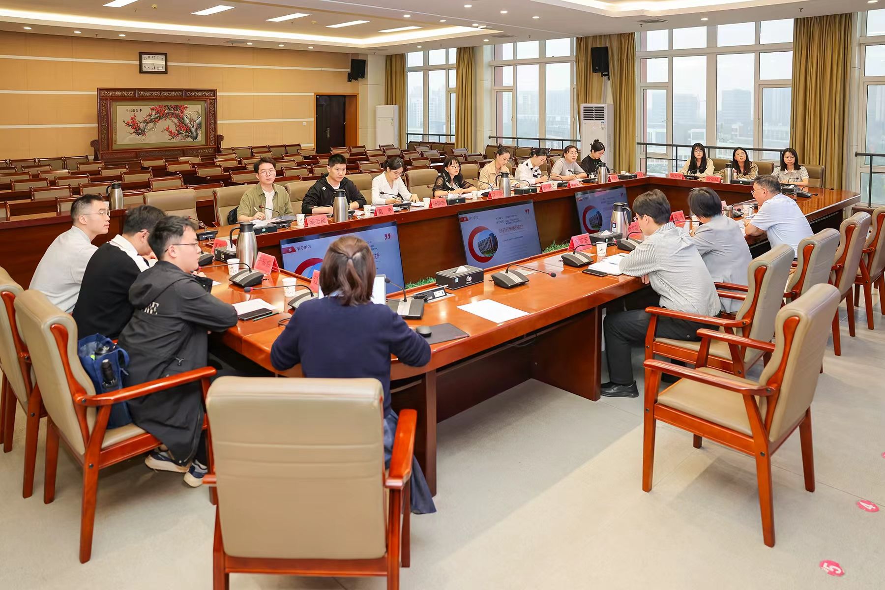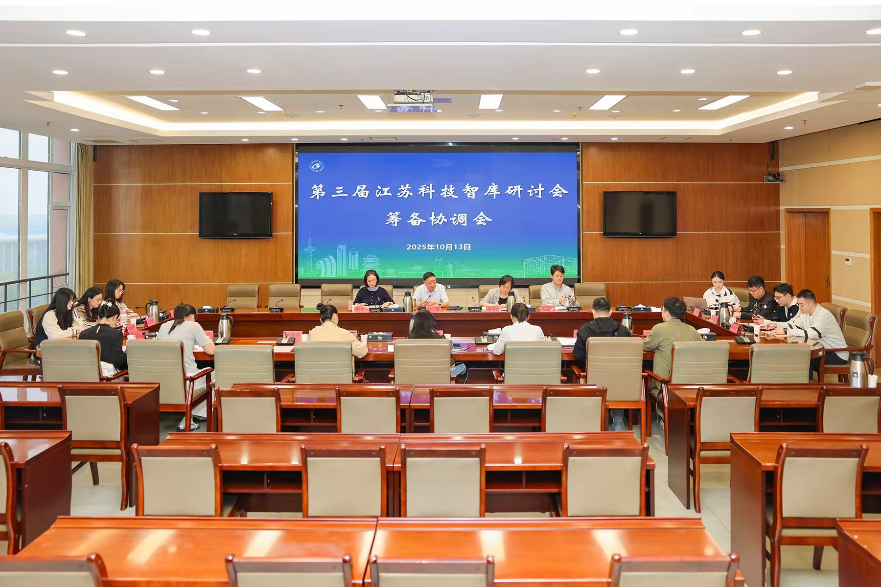为确保即将到来的第三届江苏科技智库研讨会能够顺利、高效、成功召开,10月13日下午,第三届江苏科技智库研讨会筹备协调会在行政楼九楼视频会议室举行。校党委副书记薛浩教授主持会议,校办、宣传部、机关党委、文科学院、智库相关人员、社科处全体人员及学生志愿者20余人参会。
