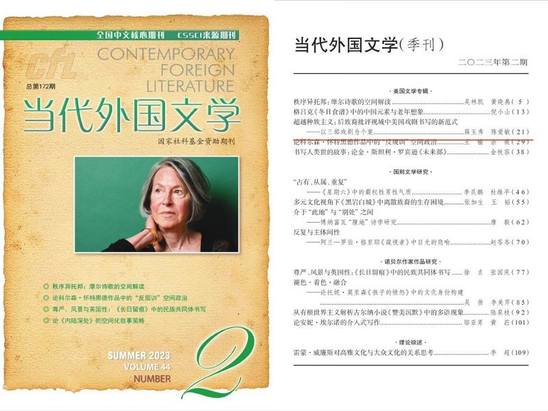 外国语学院薛玉秀老师的文章《超越种族主义:后族裔批评视域中美国戏剧书写的新范式—以三部戏剧为个案》,在当代外国文学2023(02)期刊出。