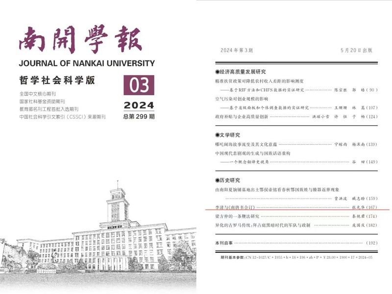 人文社会科学学院张光华老师的文章《李清与<南唐书合订>》,在南开学报(哲学社会科学版)2024(03)期刊出。