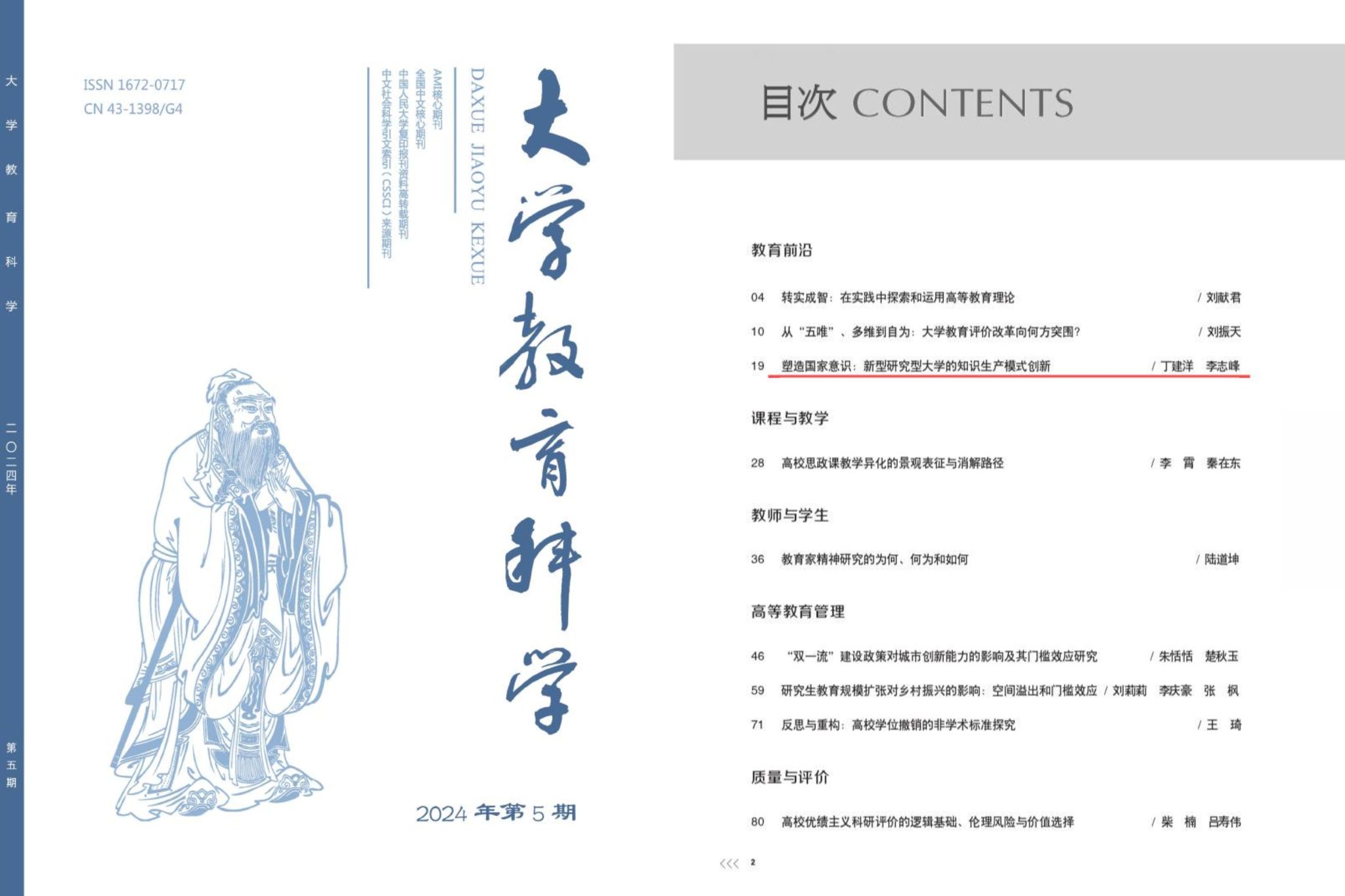 经济管理学院丁建洋老师的文章《塑造国家意识:新型研究型大学的知识生产模式创新》,在大学教育科学 2024(05)期刊出。