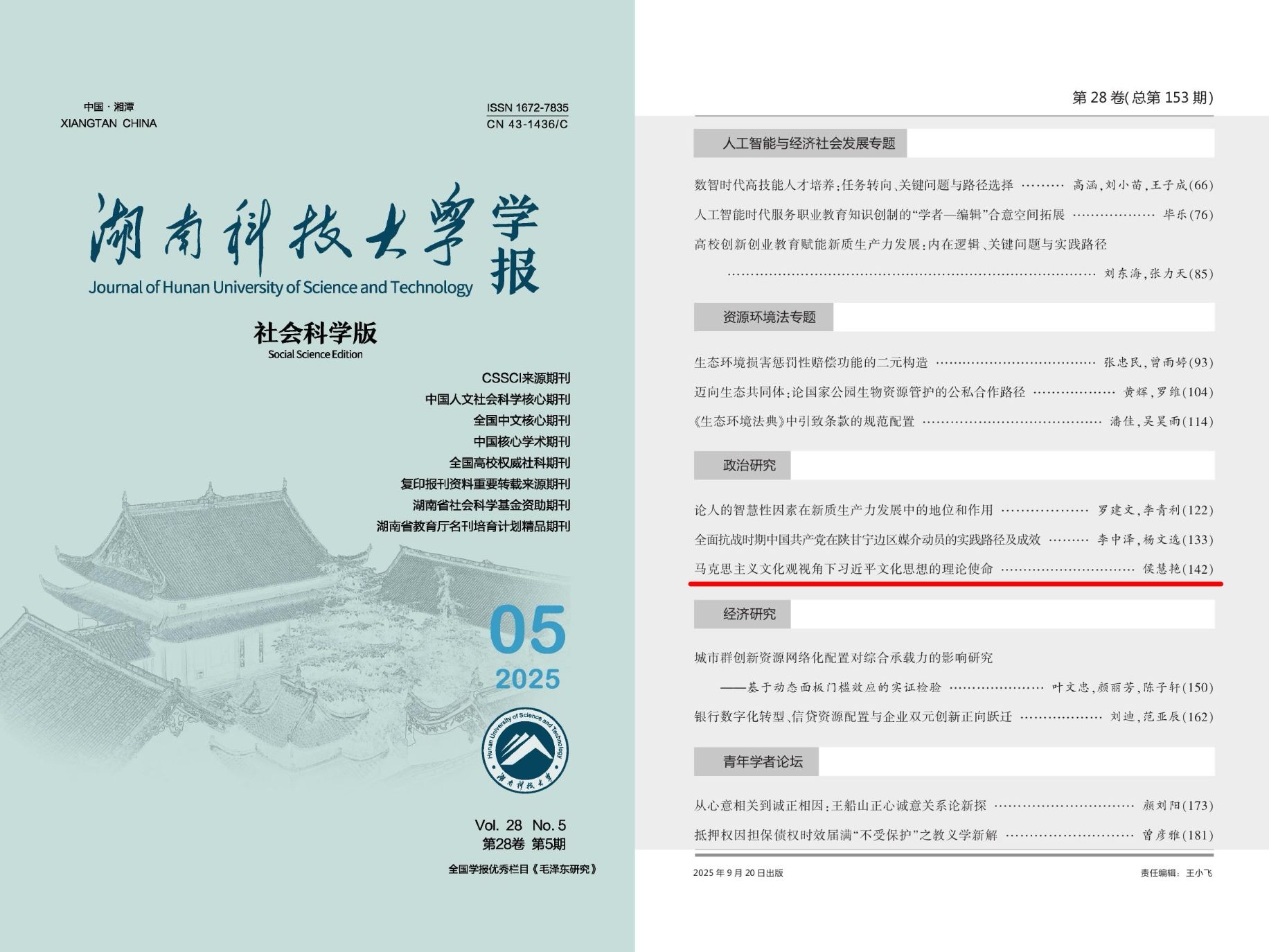 马克思主义学院侯慧艳老师的文章《马克思主义文化观视角下习近平文化思想的理论使命》,在湖南科技大学学报(社会科学版) 2025 ,28 (05)刊出。